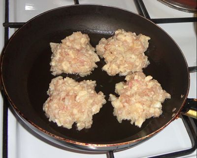 Далее все по стандартной схеме: наливаем в сковороду масло и начинаем готовить котлеты на среднем огне. Обжариваем точно так же, как оладьи. Желательно делать котлетки не слишком толстыми, иначе они получатся сыроватыми. Обжариваем примерно 4 минуты с одной стороны и еще столько же с другой.