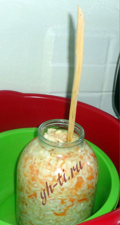 Желательно постараться не допускать утечки сока и своевременно прокалывать капусту, чтобы выпустить воздух. Прокалывать лучше веточкой черемухи, заранее очищенной от коры. Прокалываем раза 3-4 в день.