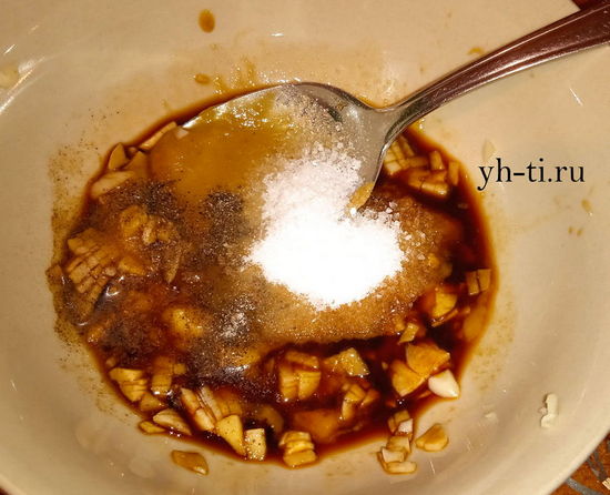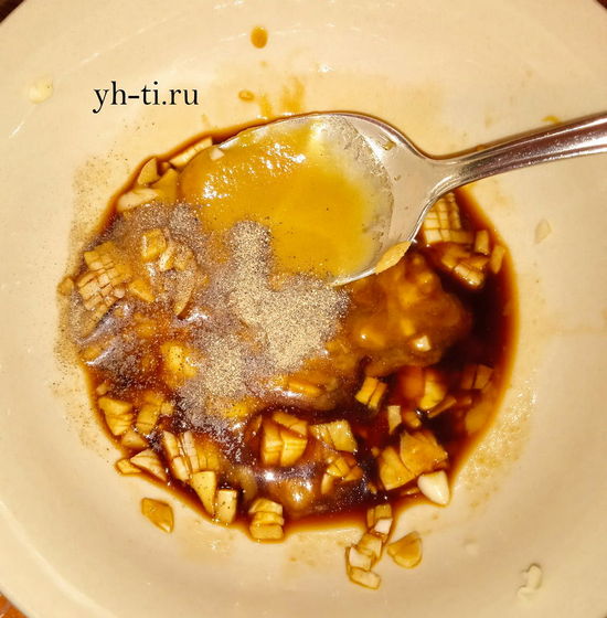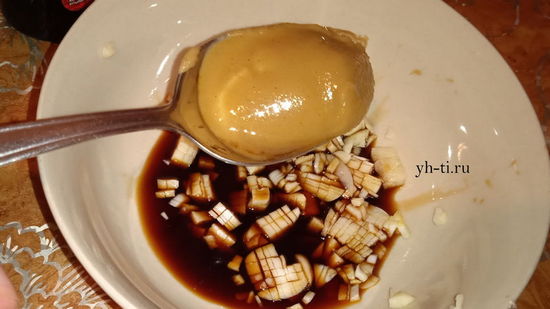 Теперь готовим маринад, для этого смешиваем соевый соус, горчицу, измельченный чеснок и немного черного молотого перца, можно еще добавить соли. Этим соусом натираем утку снаружи и внутри. Накрываем её пищевой пленкой или пакетом и отправляем в холодильник на ночь.
