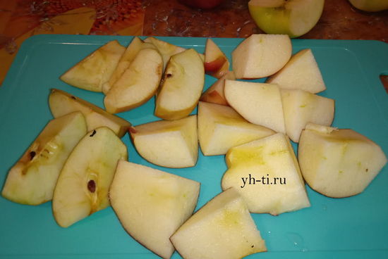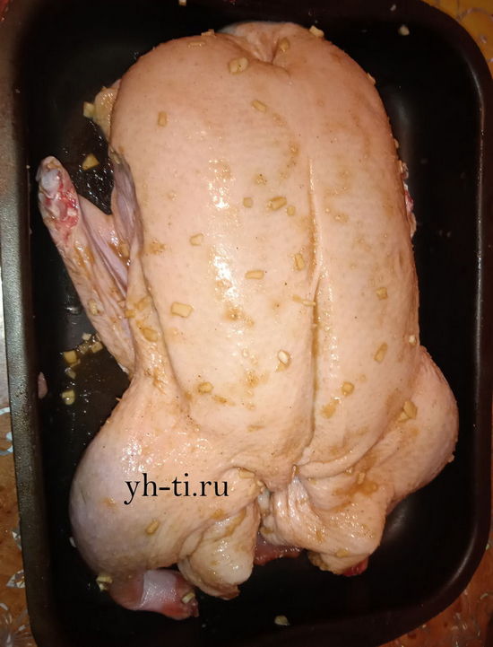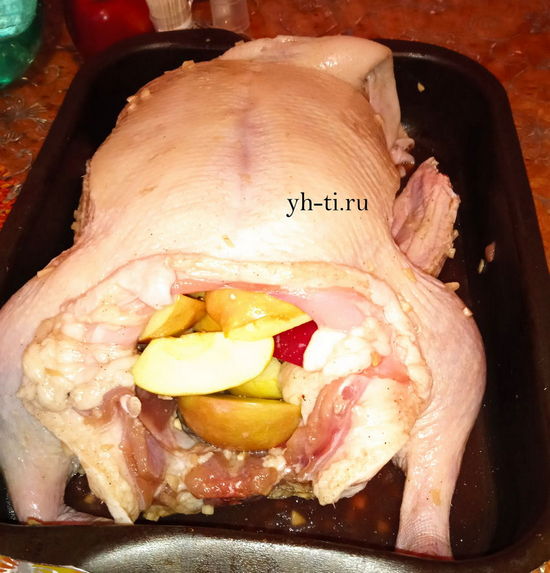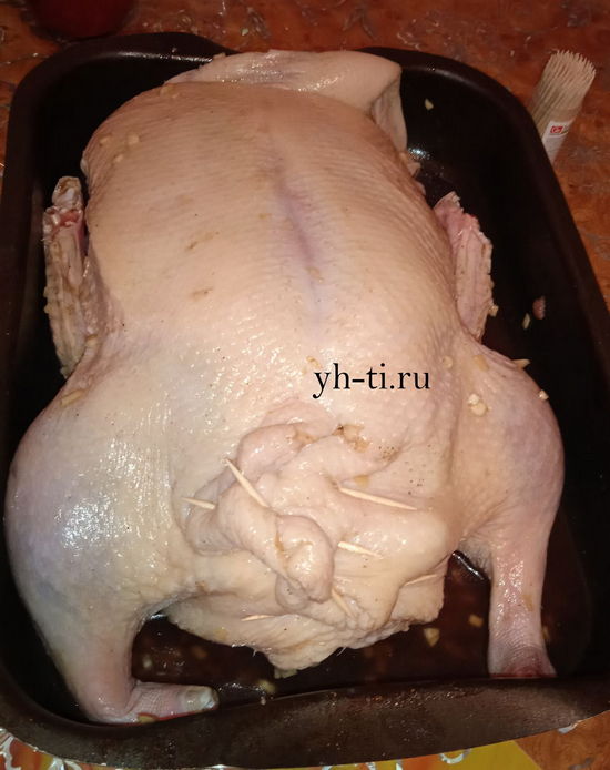 Итак, замаринованную птицу начиняем порезанными яблоками и закрепляем зубочистками или шпажками. Кстати, гузку и нижние части крыльев лучше срезать. Выкидывать их не нужно, они сгодятся для наваристого бульона.