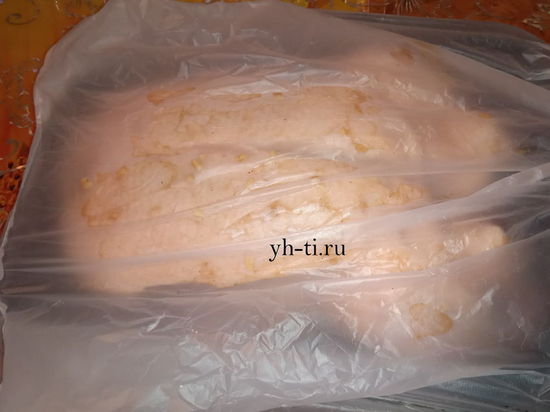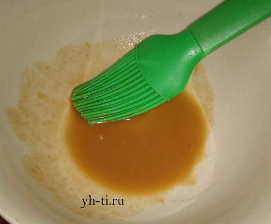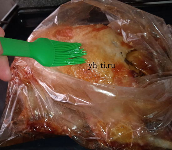 Вытаскиваем курицу из духовки, разрезаем пакет и смазываем соусом, ставим в духовку еще на 1 час