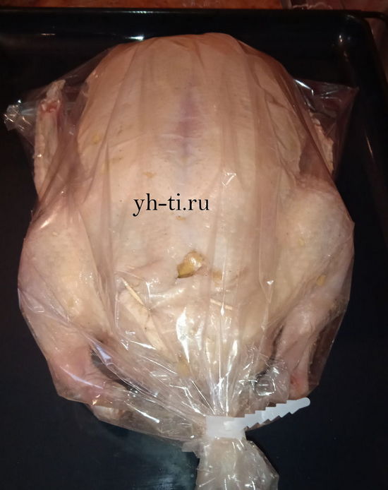 Помещаем утку в рукав, делаем в нем несколько дырочек и ставим в духовку. Выпекаем 2 часа при температуре 150 градусов.