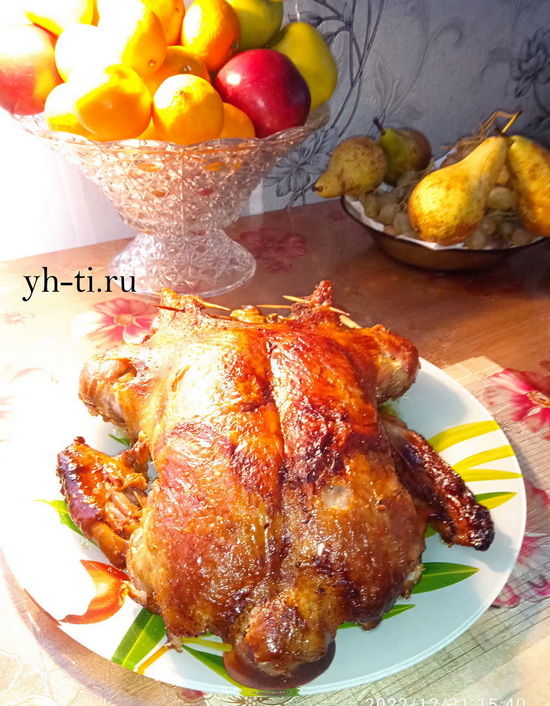 За 8 — 12 часов утка хорошо пропитается маринадом и уже будет готова к запеканию. Лучше всего делать это в рукаве или в закрытой чугунной жаровне. Если вы будете запекать просто на противне, то закройте птицу сверху фольгой. Выпекать утку целиком нужно долго( у меня на это ушло 3 часа). И если она будет не накрыта хотя бы фольгой, то получится совсем сухой и жёсткой.