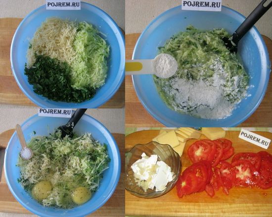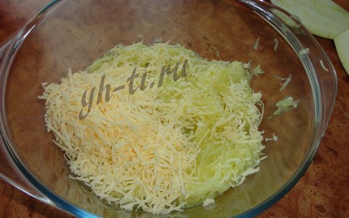 Натираем кабачок, добавляем все компоненты поочередно, не забываем каждый раз при этом перемешивать тесто.
