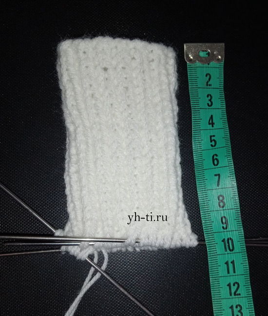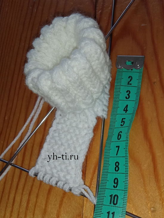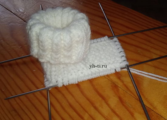 Изначально я важу на 4 спицах, так как петелек мало. Вяжем резинкой 1*1 до желаемой длины. У меня это 9 — 10 см. Затем переходим к вязанию «язычка». Быть может, эта часть пинетки правильно называется по-другому, но я привыкла называть её так.