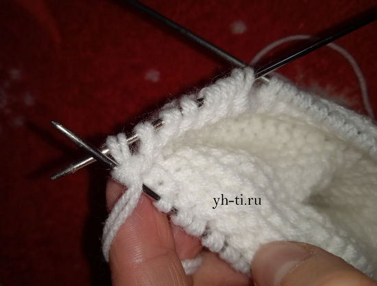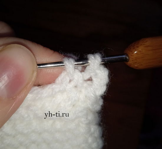 Теперь по бокам «язычка» нужно поднять петли. По 9 петель с одной и с другой стороны. Поднимаем за нижнюю стенку петли (ту, что ближе к изнаночной стороне), тогда на лицевой стороне будет получаться красивая косичка. Если поднимаете петли за другую стенку — не критично, просто с косичкой, на мой взгляд, пинетки имеют более четкий контур.