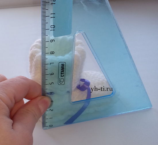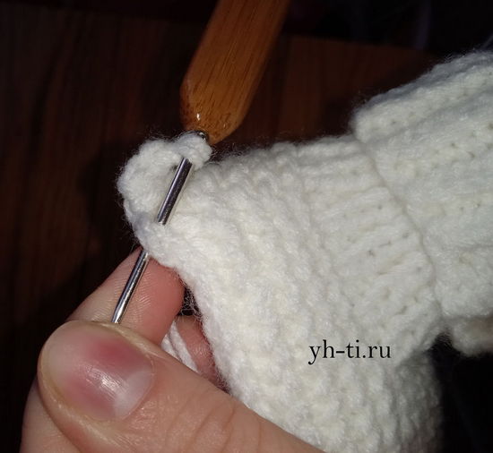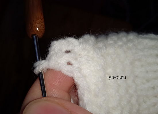 Первый ряд. Вводим крючок в последний ряд изнаночных петель сбоку пинетки. И провязываем один круг по этой изнаночной “волне” вдоль всей пинетки. Вяжем полустолбиком без накида.