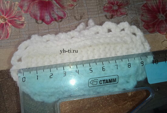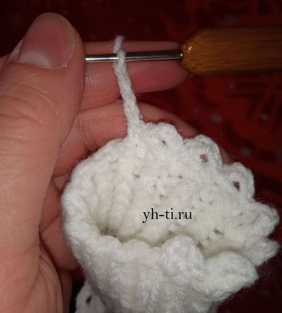 Верх пинетки украсим фестонами, только теперь будем вязать в одну нить. Чтобы краешек получился более изящный.
