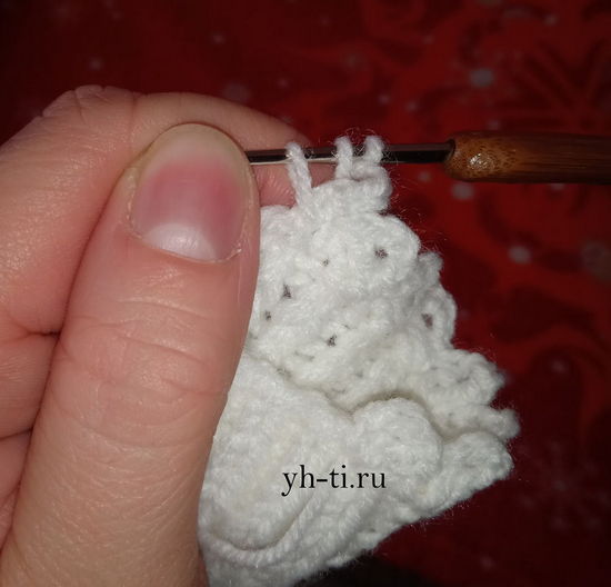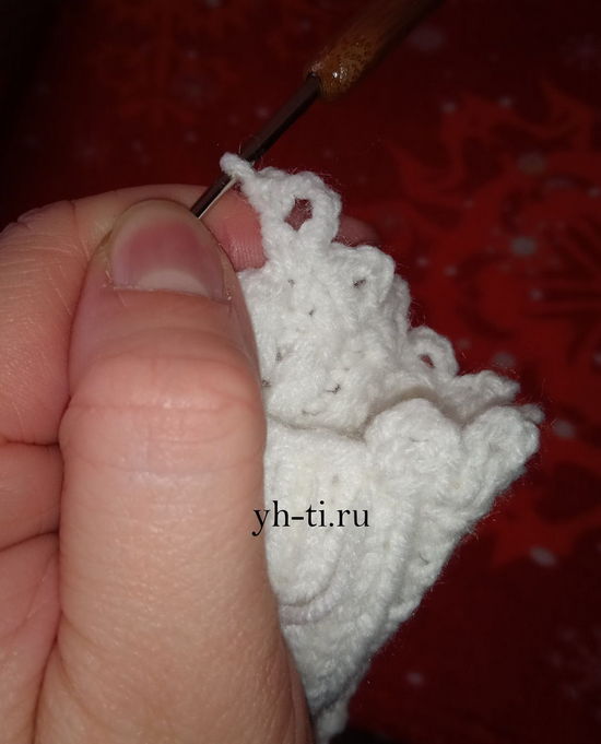 Далее все повторяется. Вяжем 3 воздушные петли, делаем столбик с накидом в эту же петлю. И получившийся фестончик цепляем к краю пинетки через одну петлю. Очень хорошо показано, как обвязывать край пинетки фестонами на видео ниже. Время уже установлено на видео ( с 19.46 мин.).