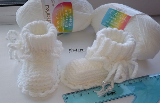Белоснежные вещи всегда самые красивые, хоть и цвет сам по себе простой и пинетки получились чудесные! При желании можно купить пряжу кислотных оттенков и сделать их яркими и оригинальными. Рюши на вещах это вообще отдельная песня, с ними любая вещь превращается из скучной повседневной в нарядную и праздничную. Да и вообще такие пинетки в подарок милое дело, особенно связанные своими руками.