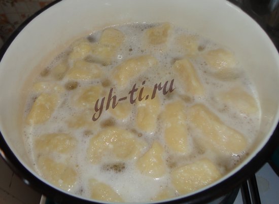 В теплое растопленное масло добавляем соль, сахар и творог. Перемешиваем и вбиваем яйца. Вводим муку до густоты теста. Режем тесто на кусочки и отвариваем в подсоленной воде, периодически помешивая.