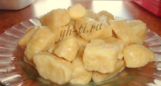 В творог добавляем растопленное масло, желтки, соль и сахар, все перемешиваем. Ход лепки и варки такой же, как и в предыдущих рецептах.