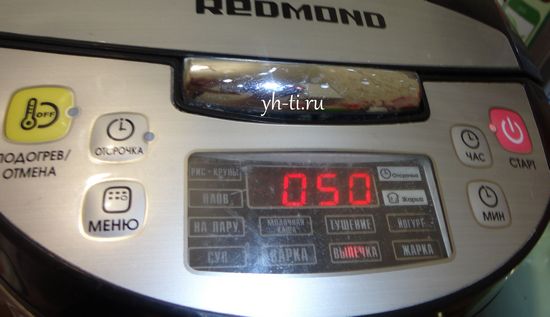 Помещаем форму в мультиварку, выбираем режим “Выпечка”, устанавливаем время готовки 50 минут и включаем “Старт”. Возможно, для вашей мультиварки есть другие рекомендации, лучше проверить это в своей книге рецептов. Однако, на мой взгляд, особых отличий быть не должно. Марка мой мультиварки — Redmond.
