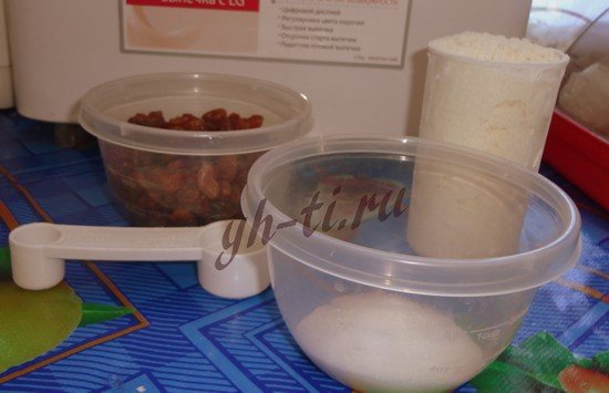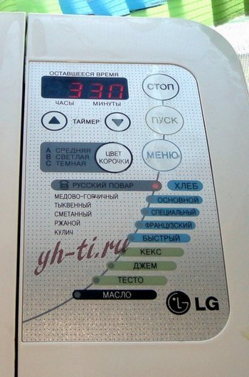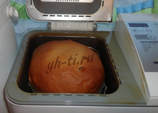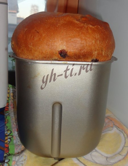 Согласно рецепту в форму добавляются все ингредиенты по-порядку из перовой закладки. А после звукового сигнала добавляются ингредиенты из второй закладки. Программа для выпечки на печах LG — “Русский повар”. Кстати, изюма я насыпаю почти в два раза больше, чем указано в рецепте, по-моему так вкуснее. 🙂