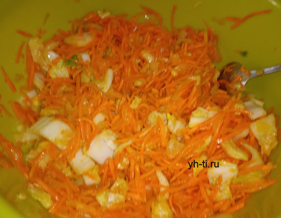 И в завершении добавляем в морковь пекинскую капусту. Перемешиваем и даем настояться пару часов. Хотя я всегда сразу же накладываю тарелочку и с удовольствием уплетаю. Получается очень вкусно. Особенно хорошо сочетается такой салат с мясными блюдами. Попробуйте, вам обязательно понравится.