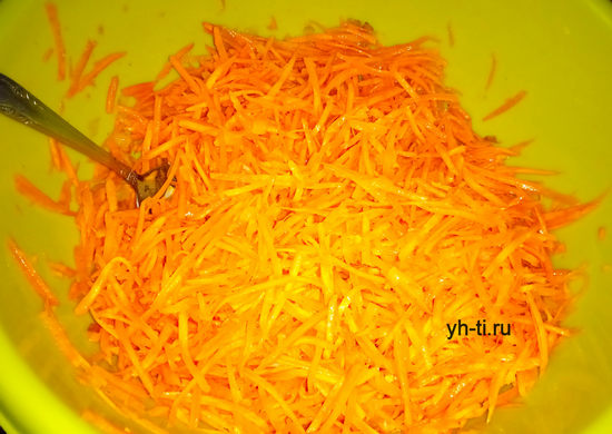 Тем временем займемся морковью: чистим её и натираем на терке для корейской моркови.