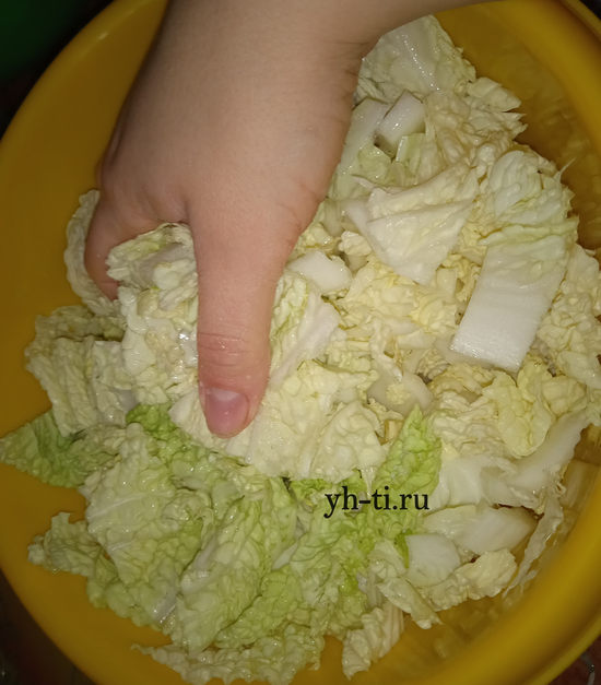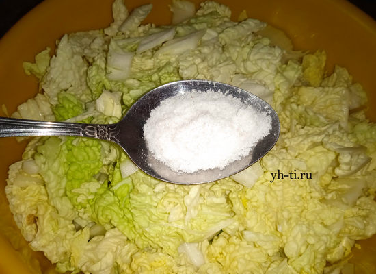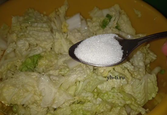 Нарезанную пекинку отправляем в миску, добавляем масло, соль, сахар и уксус. Не обязательно класть строго, как в рецепте. Пробуйте по вкусу, ведь количество капусты может отличаться. Хорошо перемешиваем и убираем в холодильник мариноваться.