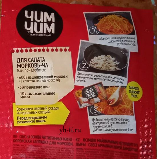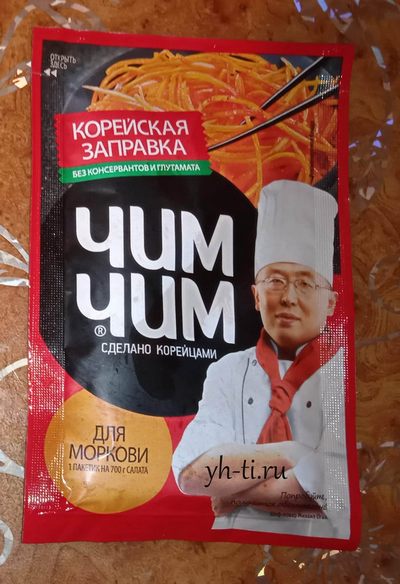 И в конце добавляем заправку для корейской моркови. Мне очень нравится заправка Чим Чим, она в меру остренькая и хорошо пропитывает морковь. Хорошо всё перемешиваем. Удобнее это делать руками, морковь даже можно немного помять.
