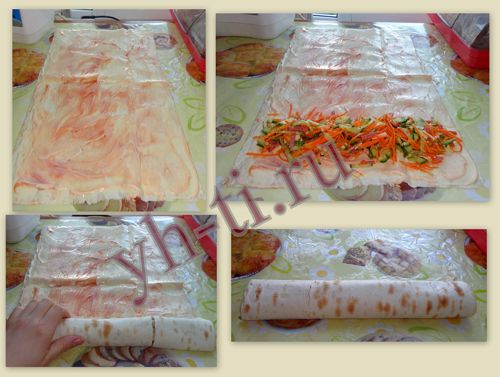 Теперь все ингредиенты перемешайте в тарелке. Разложите на столе лаваш, смажьте его кетчупом и майонезом. Выложите начинку на край лаваша и скрутите в рулет. Можно раскладывать начинку на весь лаваш, здесь уже дело вкуса.