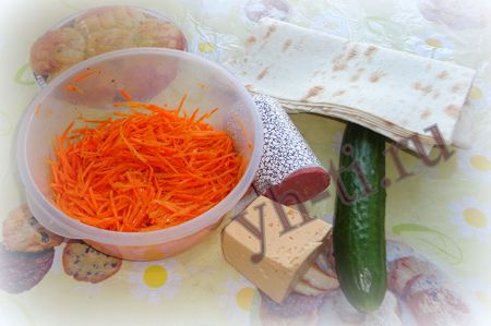 Порежьте соломкой сыр, колбасу и огурчик. Корейскую морковь можно взять уже готовую или приготовить самостоятельно.