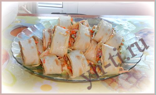 Это, конечно, далеко не все варианты начинок, только самые распространенные и вкусные. Как вы поняли, завернуть можно все, что хочется. К примеру, я очень люблю корейскую морковь, и в зависимости от того, что имеется в холодильнике, миксую ее или с колбасой, или с ветчиной, или с рыбкой, или с курицей (можно даже с копченой). Для свежести всегда добавляю огурчик, модно заменить помидором или соленым огурцом, на худой конец.
