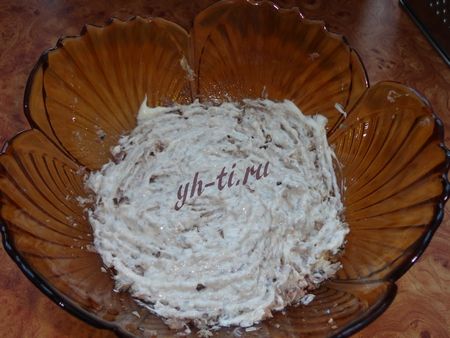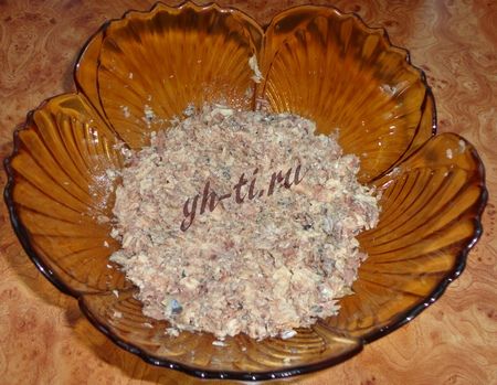 Рыбные консервы выкладываем в салатную тарелочку и разминаем вилкой. Это первый слой нашей “Мимозы”. Смазываем рыбку майонезом.