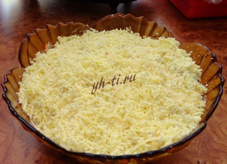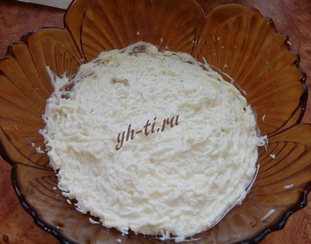 Затем натираем на терки белки от яиц и выкладываем их вторым слоем. Смазываем майонезом.