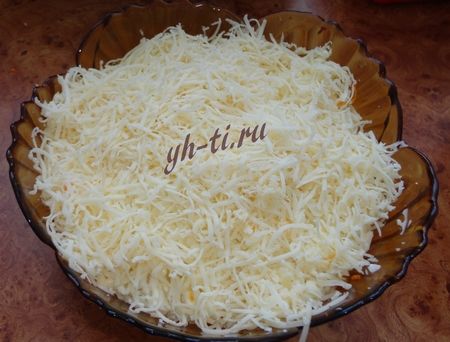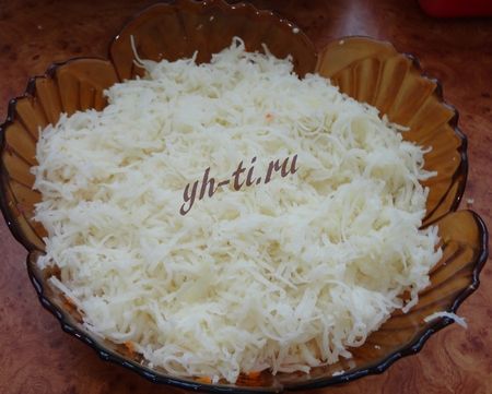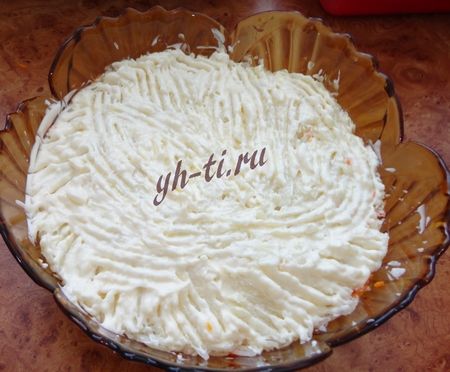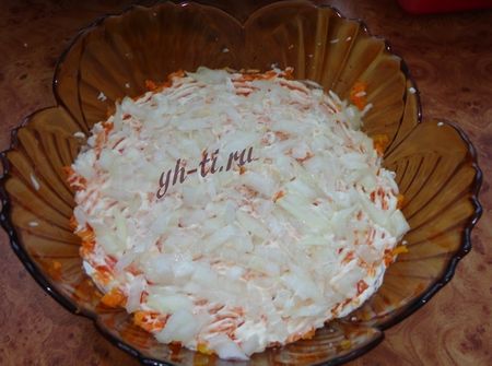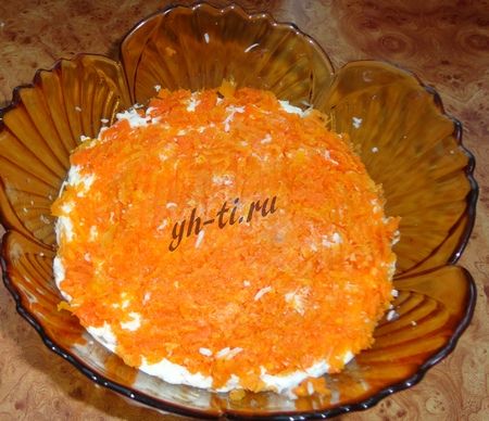 Третий слой — морковь. Я натираю ее на терке, как и все ингредиенты (кроме рыбы и лука). Выкладываем и смазываем майонезом.