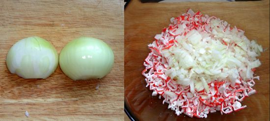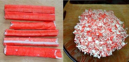 Пока готовятся вышеупомянутые ингредиенты, приступайте к нарезке крабовых палочек. Резать их желательно помельче. В среднем у меня всегда уходит одна упаковка.