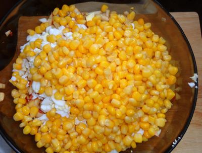 Теперь высыпаем консервированную кукурузу – 1 банку. (Водичку предварительно слейте).