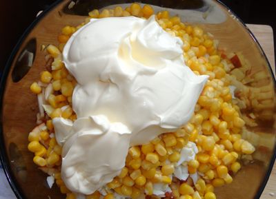 Салат с кукурузой вкусный, питательный, а самое главное на его приготовление уходит незначительное время, всегда им пользуюсь на скорую руку, когда гости невзначай нагрянут.