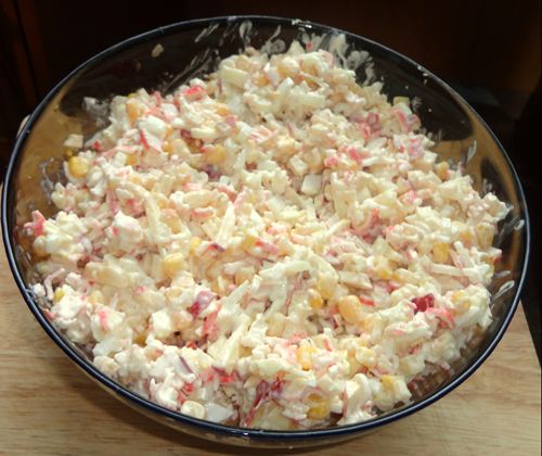 А мы ещё проще делаем: крабовые палочки, кукуруза, яйцо и майонез 🙂