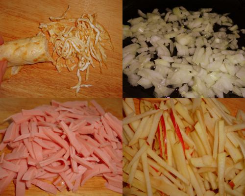 Режем блинчики, обжариваем лук, режем колбасу и яблоко