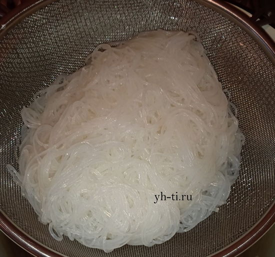 Спустя пять минут откидываем фунчозу на дуршлаг и промываем холодной водой. По желанию лапшу можно порезать кухонными ножницами.