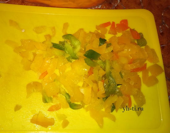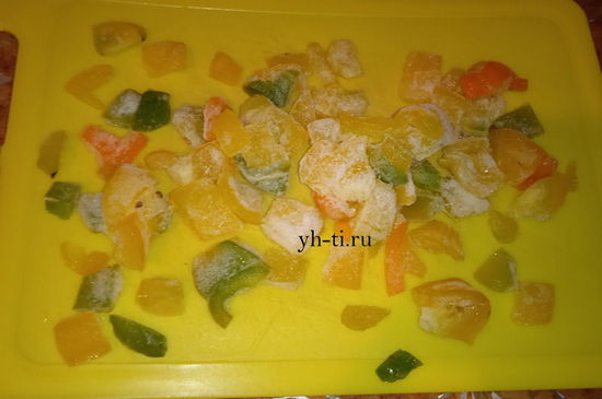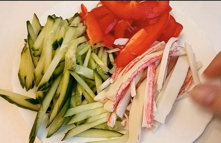 Теперь переходим к овощам. Морковь и огурец натираем на терке для корейской моркови. Болгарский перец режем соломкой. У меня перец был заморожен кусочками, поэтому длинной соломки не получилось, но это не критично.