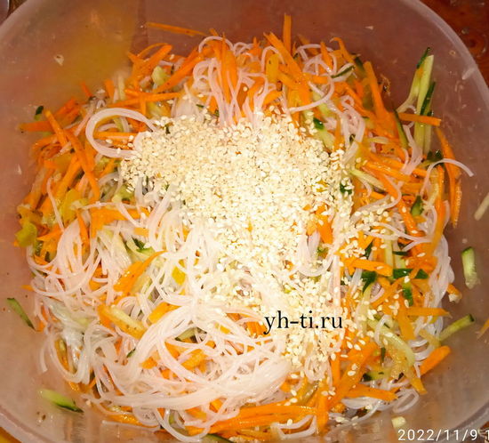 Помидор очищаем от косточек. Режем соломкой и добавляем в салат. В конце добавляем кунжут. Даем салату настояться пару часов и подаем.