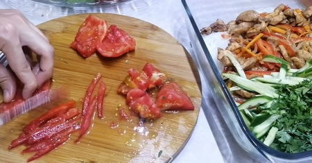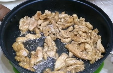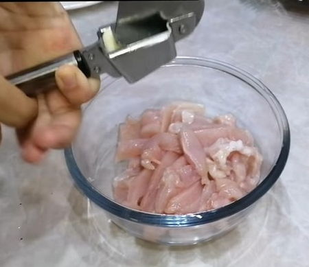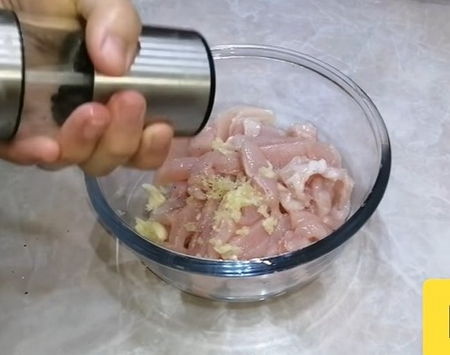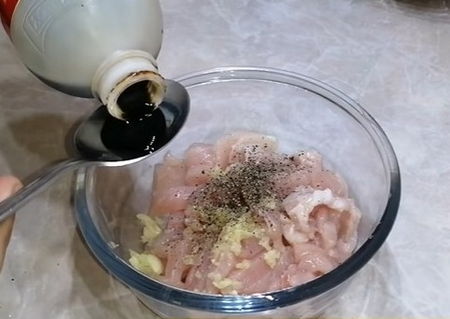 Куриную грудку нарезаем соломкой (лучше резать полу замороженную). Заливаем её соевым соусом, добавляем немного чеснока и черного молотого перчика.