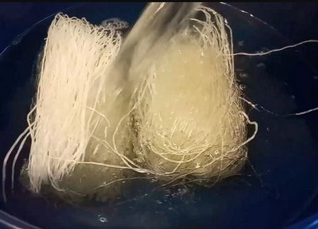 Также примечательно, что фунчоза в сухом виде имеет большую калорийность, чем в готовом. Так, после замачивания в кипятке её калорийность уменьшается в 4 раза и составляет всего 80 ккал на 100 грамм.