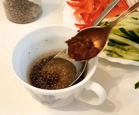 Для заправки используем всё то же самое, что и в предыдущем рецепте. Или опять-таки максимально упрощаем задачу и используем готовую.