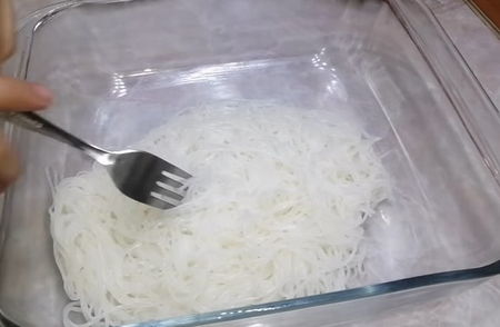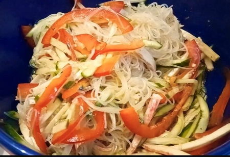 Готовится бобовая лапша очень просто и быстро — достаточно просто залить её кипятком и оставить на несколько минут. Кстати, на пачке с лапшой есть все инструкции по её приготовлению. Там же есть рецепт и салата. И на пачке с заправкой тоже можно найти интересный рецепт.
