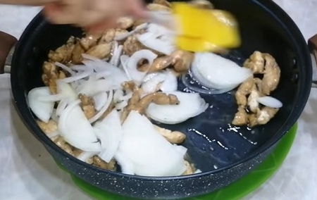 Лук режем тоненькими полукольцами и отправляем к курице, обжариваем пару минут.