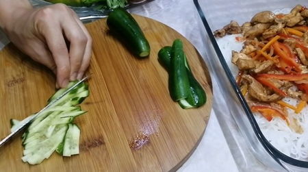 Фунчозу по желанию порезать ножницами. Добавить порезанные соломкой перец, огурец и зеленый лук.