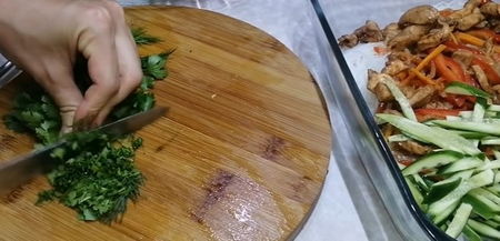 Свежий огурчик режем соломкой и отправляем в салат. Туда же закидываем порезанную зелень укропа и кинзы (или петрушки).
