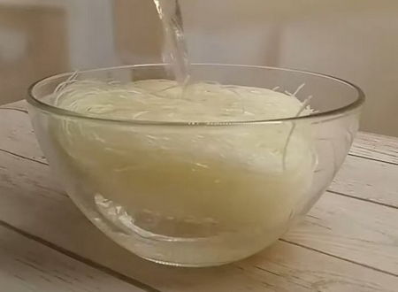 Фунчоза или по-другому «стеклянная» лапша — превосходный наполнитель для салатов. Изготавливают такую лапшу из бобового крахмала. Она практически не имеет вкуса, поэтому пропитывается и набирает аромат и вкус ингредиентов, которые с ней соседствуют в одном блюде.