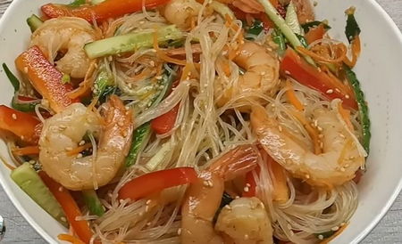 Сделать заправку или использовать готовую. Залить салат заправкой и перемешать. Салат с фунчозой и креветками готов! Остаётся только всем продуктам пропитаться в течение пары часов.