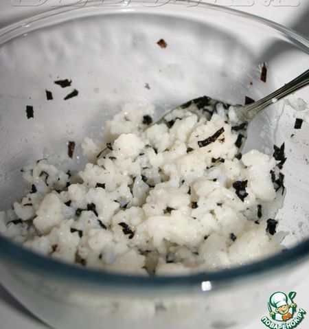 Смешайте яблочный уксус и сахар, можно добавить немножко соли. Или можно добавить соевый соус. Полученную смесь добавить в рис. Также добавляем к рису мелко нарезанный лист нори.