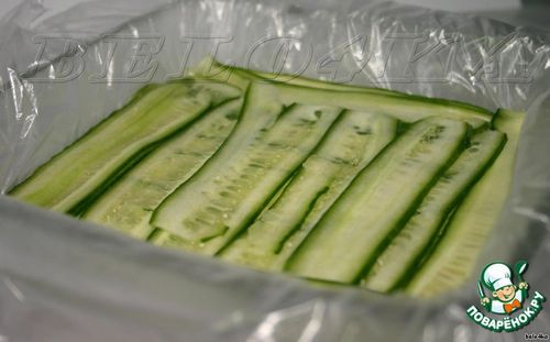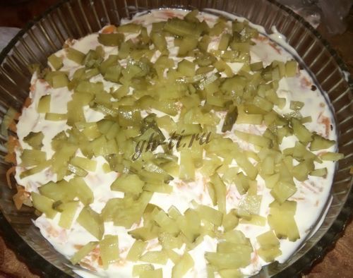 Поверх моркови кладем тонкий слой огурчиков, достаточно одного-двух.