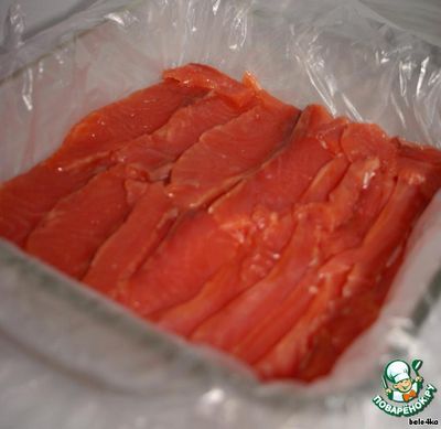 Теперь режем красную рыбу кусочками и укладываем поверх картошки.