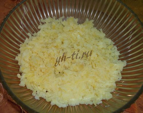 Сначала натираем на терке картошку, выкладываем и сверху смазываем майонезом.