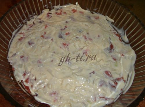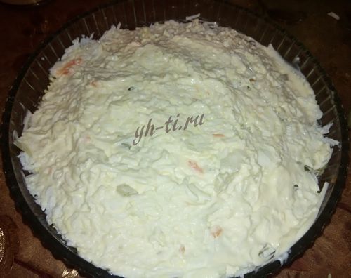Следующий слой — натертая морковь и сверху вновь майонез.